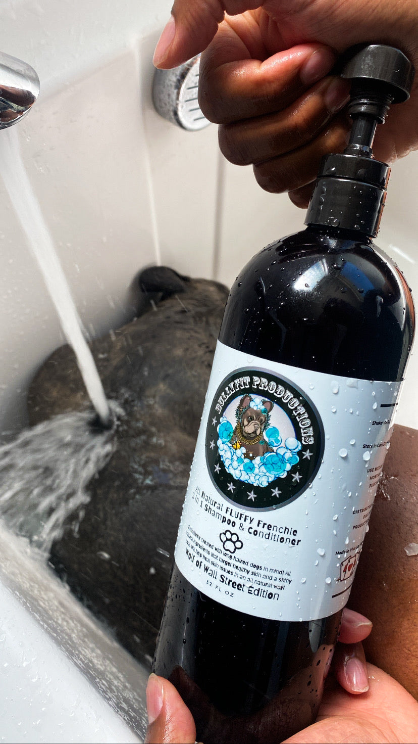 Introducing the BullyFIT All Natural Fluffy Frenchie Shampoo & Conditioner - Wolf of Wallstreet Edition 32oz — the ultimate solution for your dog's grooming needs. Designed for long, medium, and short-haired pets, this 32oz bottle with a convenient pump delivers luxurious care with each use.